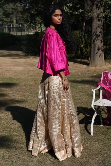 Pink silk short kurta featuring zari, zardozi, sequin, and bead embroidery. Paired with a gota embellished striped gharara.