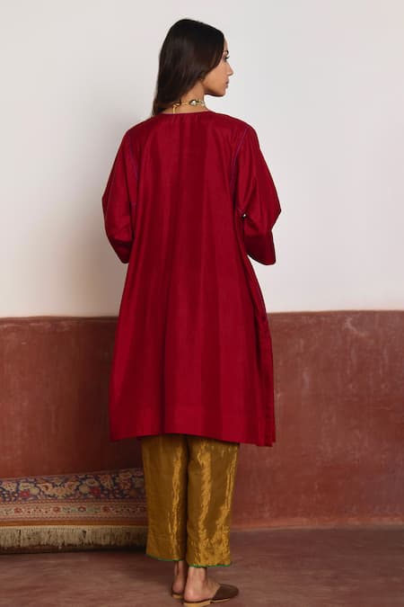 Red jhabla kurta in pure silk featuring a notched V neckline and three quarter sleeves. Paired with handloom tissue cigarette pants with a partially elasticated waistband.