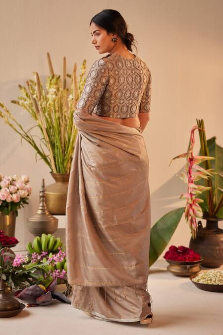 Grey pure silk saree featuring all over woven golden zari stripes and a tasselled pallu