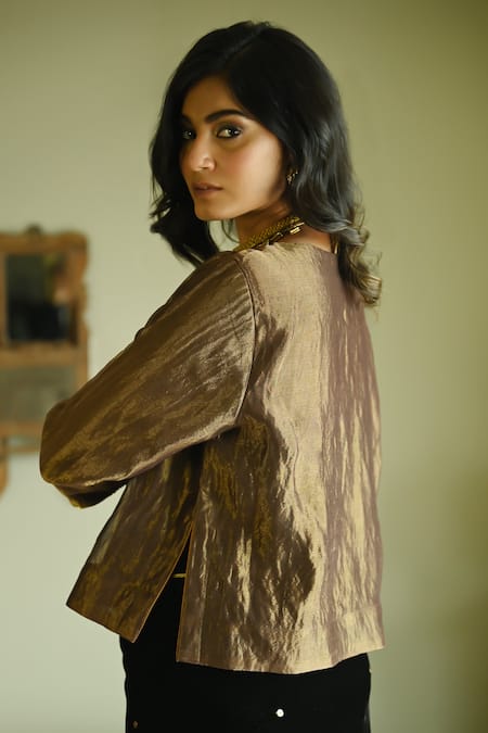 Buy_Shorshe Clothing_Brown Chanderi Silk, Tissue, Crepe V-neck Reshma Handwoven Blouse _at_Aza_Fashions