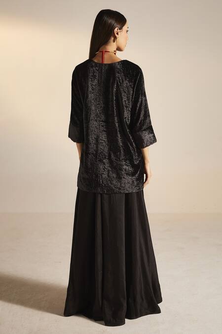 Black Gharara Silk, Kurta Velvet Floral Notched Saifi And Set