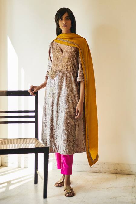 Ecru velvet kurta with brocade on the yoke, floral patchwork and cutdana embellishment. Comes with pink straight pants.
