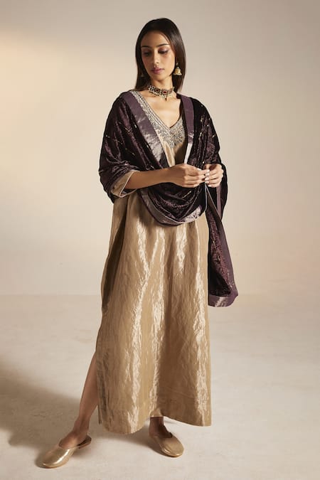 Plum sequin hand embroidered dupatta made in silk velvet base featuring a contrast velvet border.