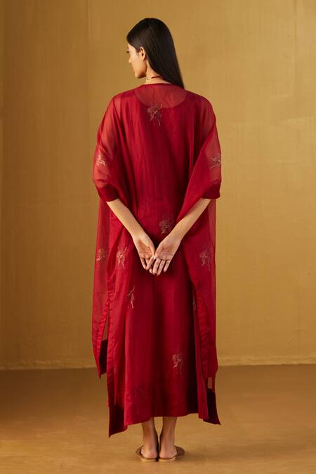 Red Organza, Handloom Cotton Waahida Hand Block Print Kaftan And Pant Set