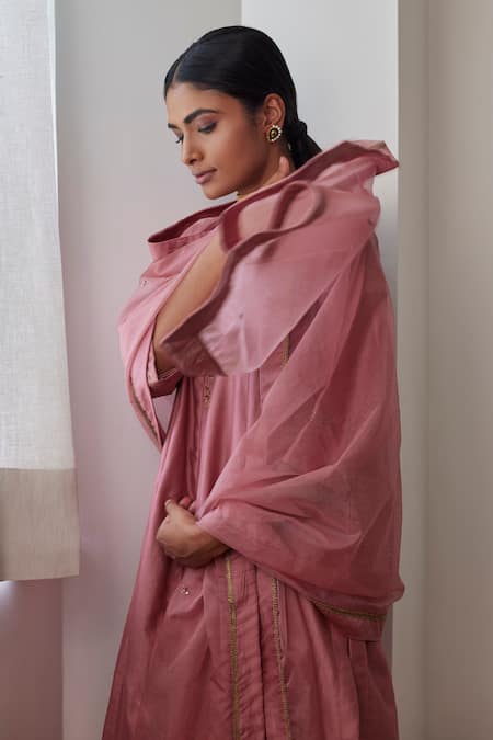 Onion pink organza dupatta featuring intricate zardozi embroidery and lace trim on the border