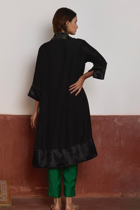 Black anarkali featuring zardozi embroidered yoke, high-low hem, and three quarter sleeves. Paired with contrast green cigarette pant with elasticated waistband.