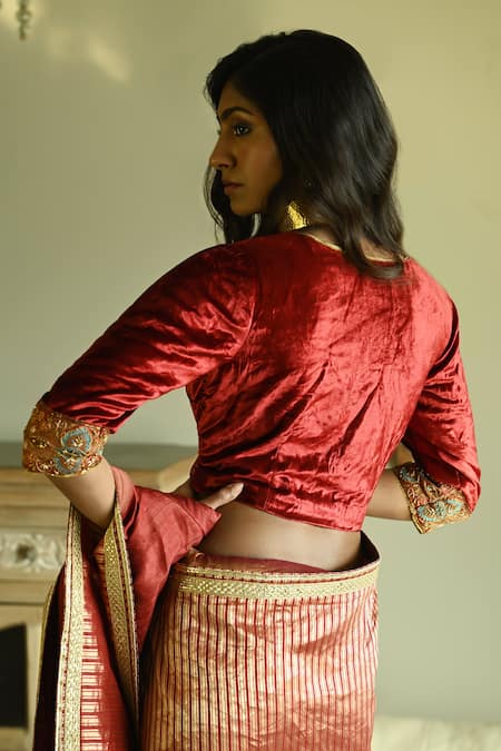 Buy_Shorshe Clothing_Red Velvet Embroidery V-neck Zubeida Blouse _at_Aza_Fashions