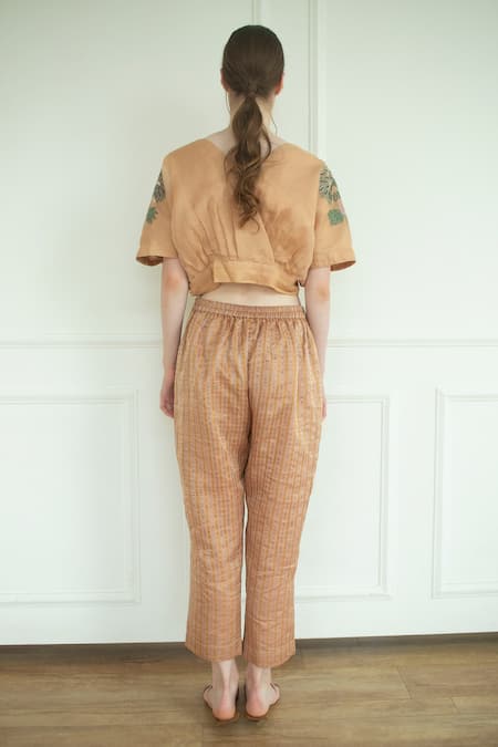 Rose gold tunic in handloom silk base with floral applique embroidery. Paired with pant.