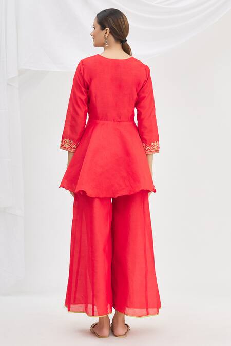 Red peplum kurta with embroidery at the neckline. Paired with flared pant and beige dupatta.