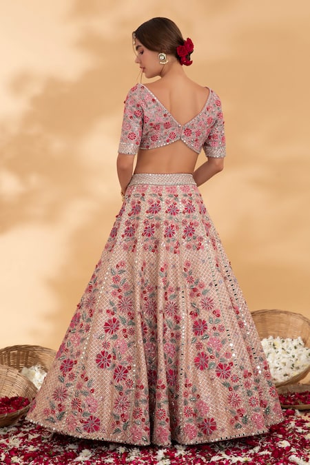 Pink lehenga featuring all over floral bloom embroidery with cutdana, beads, and sequins. Paired with a floral work blouse and dupatta.