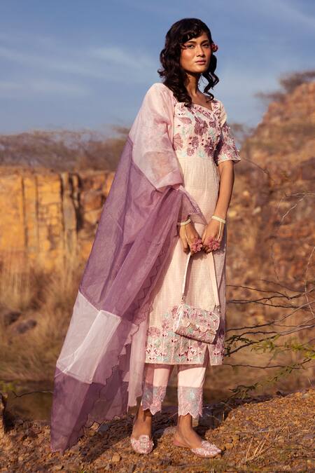 Baby blush pink kurta with floral applique embroidered on yoke, sleeves & hem. Paired with embroidered scallop organza hemline pant & organza dupatta.