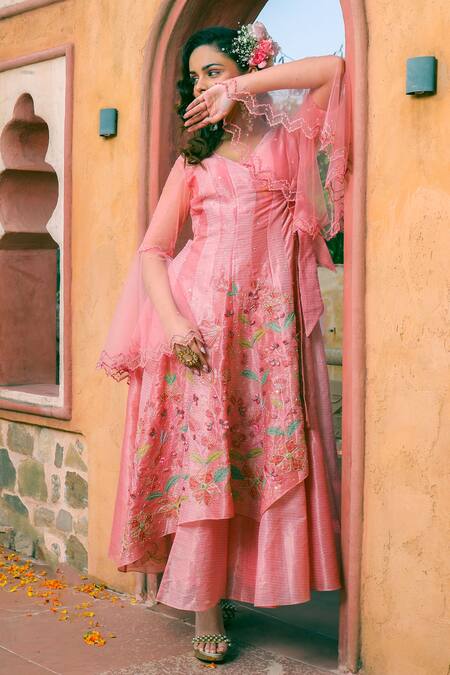 Peach angarkha featuring 3D floral applique, sequin, cutdana & bead hand embroidery with an asymmetric hem. Paired with a glace cotton pant and bustier.