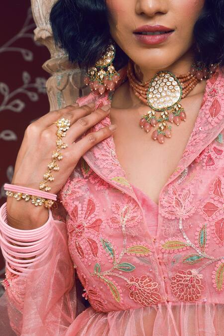 Peach jacket kurta featuring floral applique, sequin, and bead work. Paired with a matching sharara with stripe pattern and side zip closure.