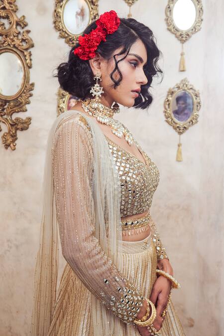 Ivory Organza, Net, Satin Mirrors, Floral Hand Embroidered Bridal Lehenga Set