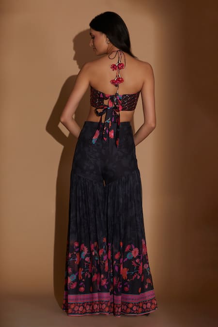 Black floral gharara featuring an embellished waistband. Paired with a halter neck top and dupatta, this set showcases intricate cutdana work and floral prints.