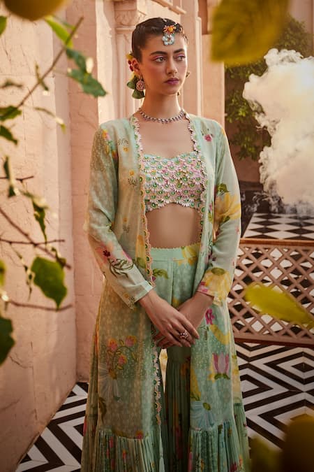 Mint green padded blouse featuring half sunflower motif hand embroidery. Paired with a gharara showcasing an all-over floral print, bead work on the waist belt, and a coordinating printed cape with half sunflower motif hand embroidery on the border.