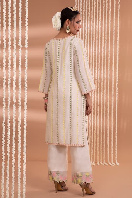 Ivory kurta featuring floral embroidery with a V neckline and three-quarter sleeves. Paired with matching floral work pants and an organza stole.