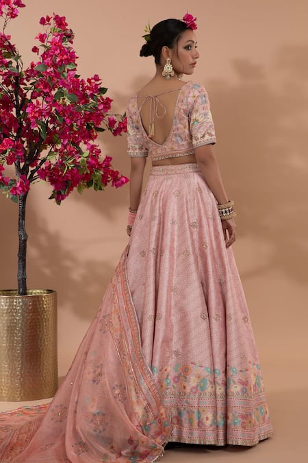 Pink Silk Sequins, Embroidery V-neck Manjari Floral Print Lehenga Set