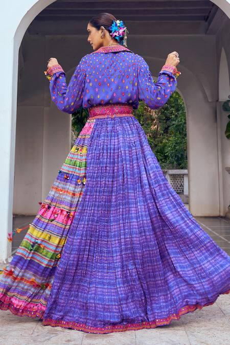 Purple rinkle satin fusion lehenga set featuring a shirt and a skirt. The shirt has a button-down front and a colorful embroidered waistband on the skirt.