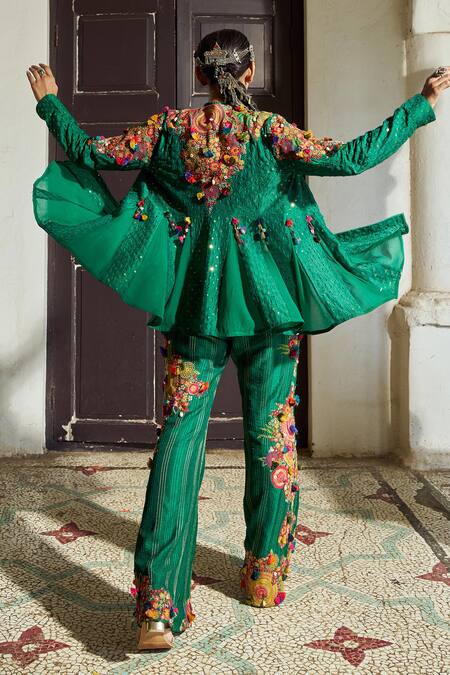Green slub silk kurta set featuring a jacket, bustier, and pant. The jacket is adorned with floral embroidery and sequins, while the pant has a pleated design.