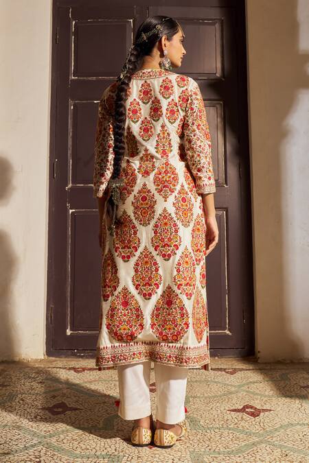 Ivory slub silk straight kurta featuring intricate floral embroidery. Paired with matching pant and dupatta.