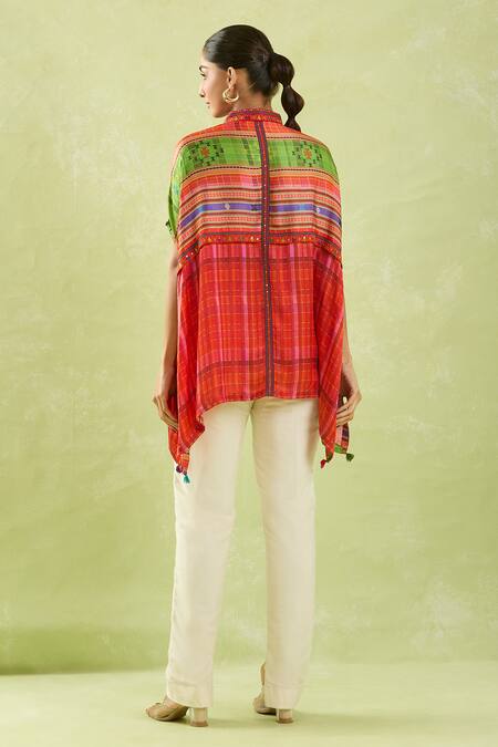 Red shirt tunic featuring a checkered print with thread and sequin embroidered collar