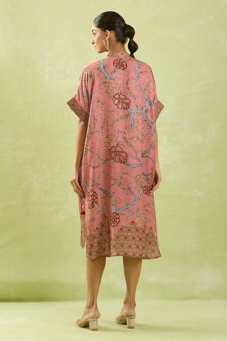 Pink Silk Smocking Mandarin Collar Floral Vine Printed Midi Dress