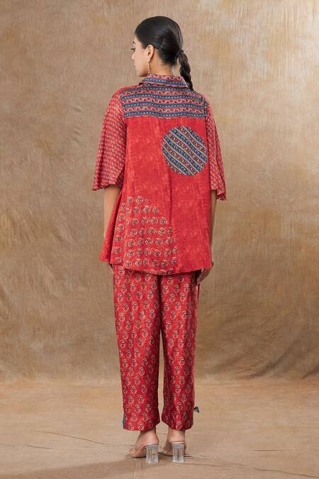 Red shirt featuring flower stripe print with bell sleeves and a collar. Paired with printed pant that complements the shirt's design.
