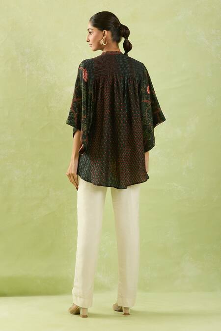 Smocked textured pattern, Flared sleeves, Mandarin collar with button closures