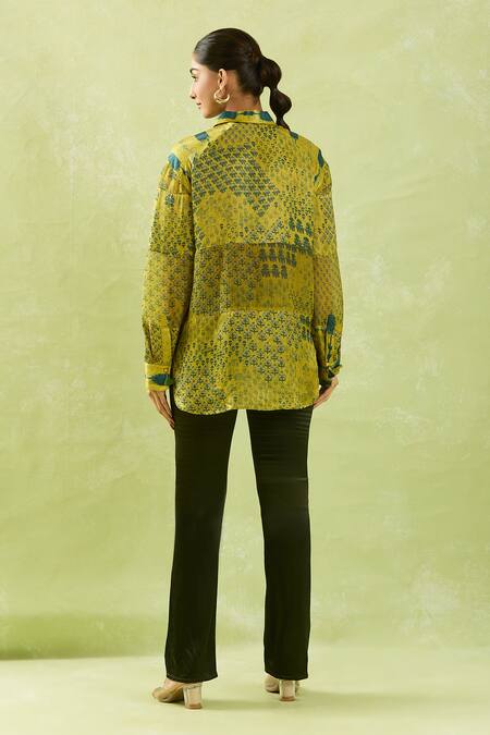Yellow Gingham, Silk Tassels Shawl Neck Floral Mughal Print High-low Shirt
