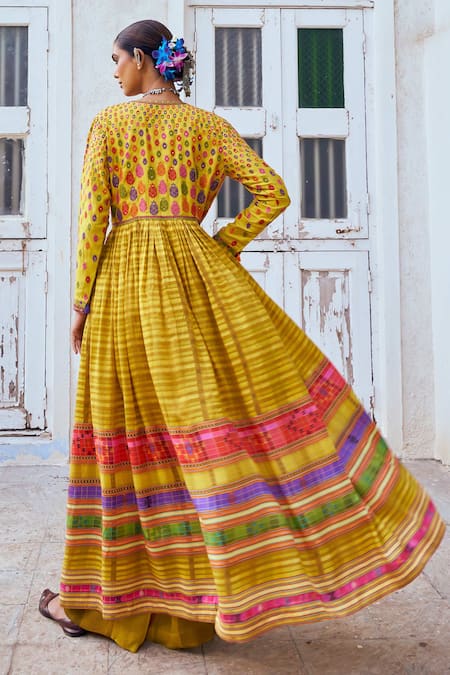 Yellow slub print kurta set featuring a long jacket, bustier, and palazzo. The jacket has vibrant patterns and an attached lining.