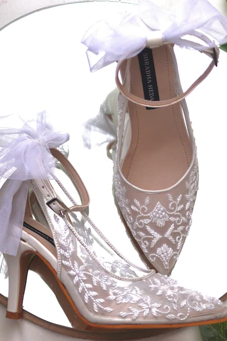Detachable bow detail on ankle straps, Bead embroidered floral pattern, Sheer straps for a delicate look