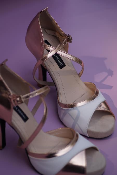 White and rose gold colour block heels featuring cross straps and ankle closure