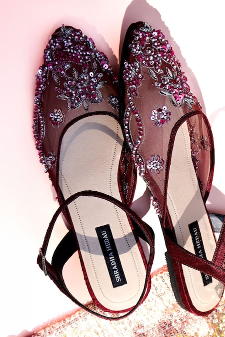 Intricate floral beadwork on organza fabric, Delicate ankle strap for secure fit