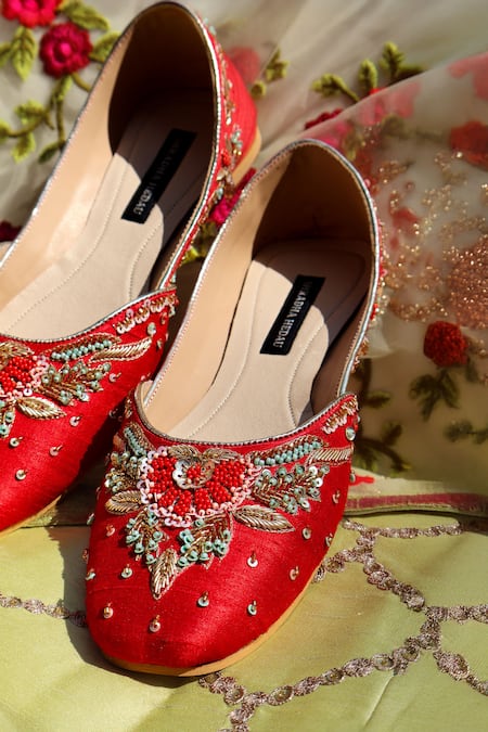 Red raw silk flats featuring intricate embroidery with beaded embellishments