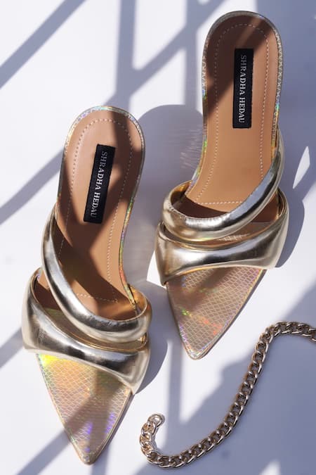 Gold pointed toe heels featuring a snake print design and strap detailing