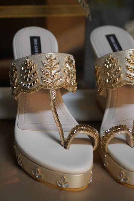 Gold wedges featuring bead embroidered floral patterned straps with mirrorwork detail