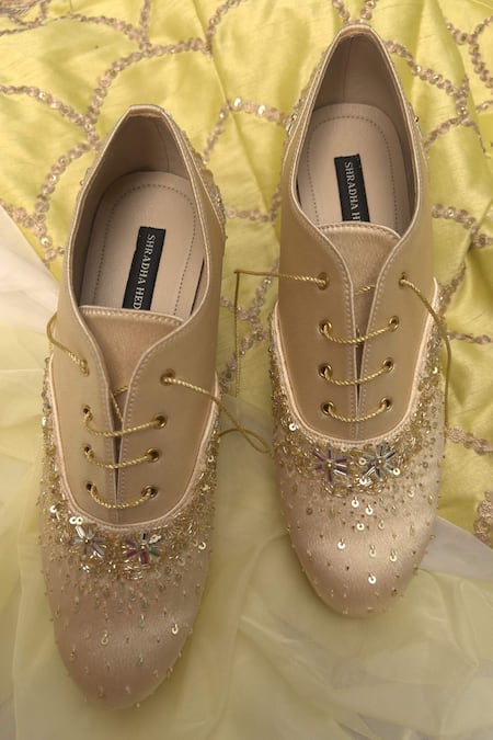 Gold sneaker wedges featuring floral scatter patterns embellished with stone, sequin, and cutdana. Constructed from satin with a 3-inch heel height and lace closure.