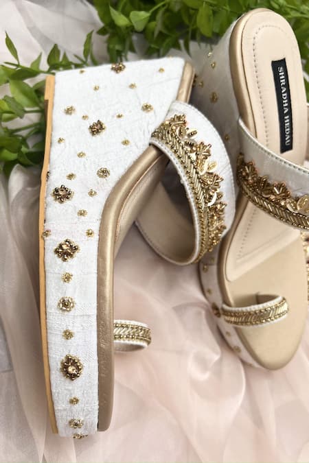 Gold kolhapuri wedges featuring cutdana, stone, and sequin embroidered vine patterns. Slip-on design with a heel height of 3 inches.