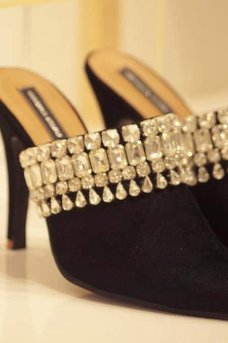 Black mule heels featuring a jewel studded vamp and a slip-on closure