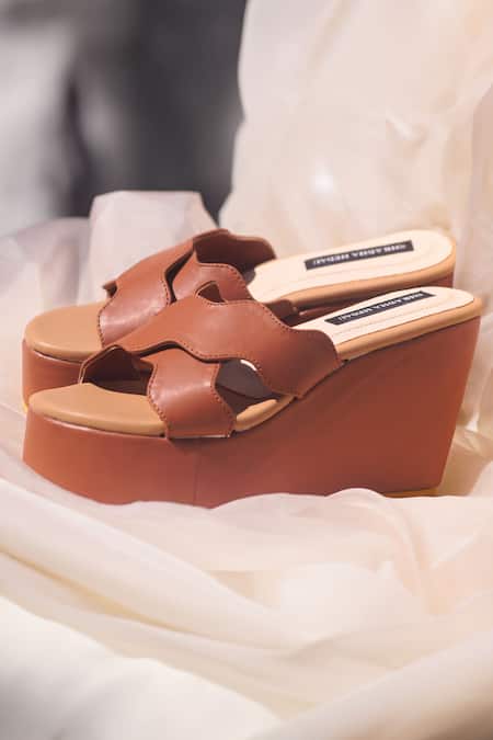 Tan platform wedges featuring scallop bordered criss-cross straps