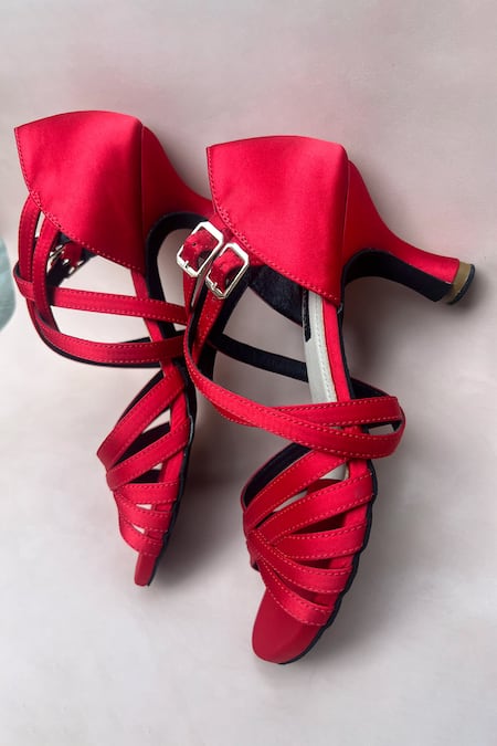 Red heels featuring a strappy design with a peep toe and adjustable ankle strap. Crafted from satin material with a heel height of 2.5 inches.