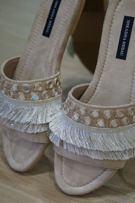 Beige flats featuring embroidered straps with tassel work and embellishments