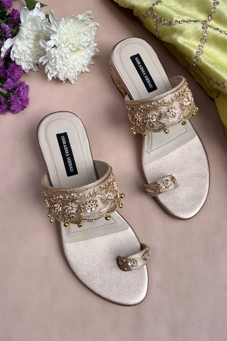 Buy_Shradha Hedau Footwear Couture_Peach Beads, Gota Patti, Zari, Embroidery Zardozi Kolhapuri Block Heels _Online_at_Aza_Fashions