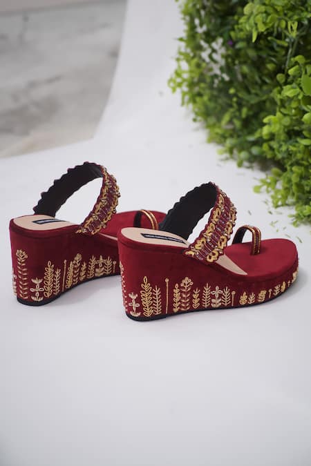 Maroon wedges crafted from velvet suede featuring cutdana, bead, and zardozi embroidery with split toe detailing