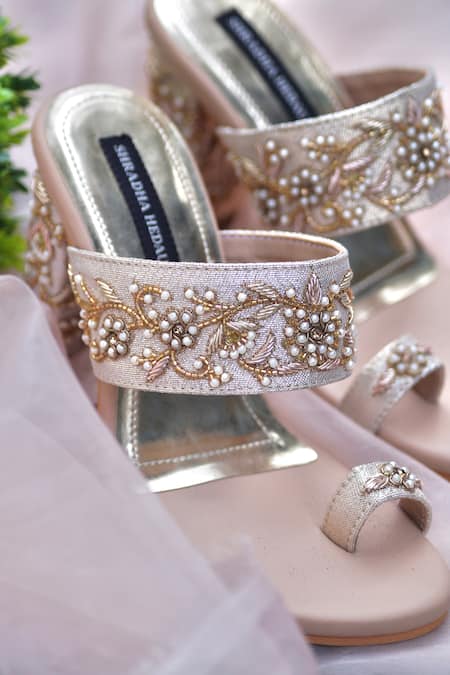 Peach embellished heels featuring floral cutdana straps and a slip-on closure