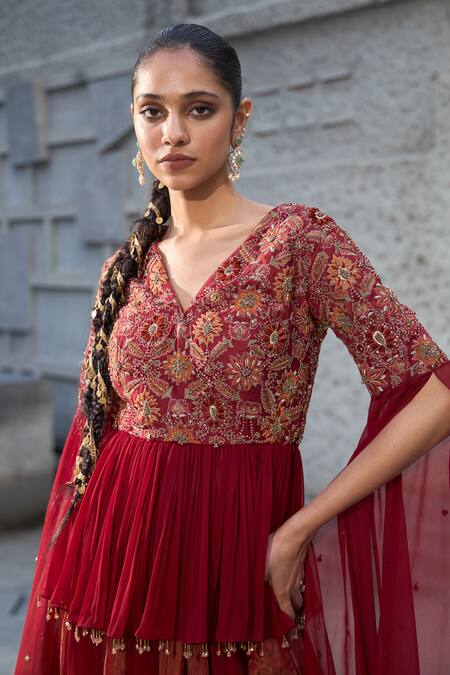 Red peplum kurta featuring V-neckline, cape sleeves, and embellished floral vine motifs with sequins and beads. Paired with a gradient panelled sharara for a complete look.