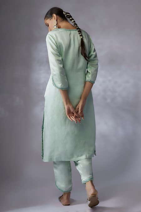 Mint blue kurta in silk linen satin featuring rafflesia bloom schiffli embroidery with sequins, beads & appliqued 3D flowers. Paired with matching straight pant and embroidered organza silk dupatta.