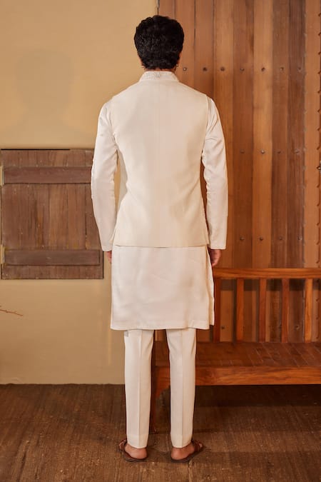 White Dupion Silk Embroidery Glass Bead Bird Bundi And Kurta Set