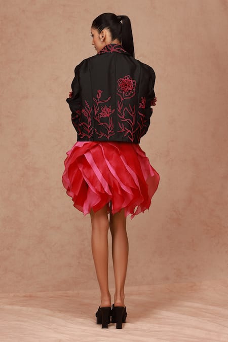 Black Taffeta Applique Collared 3d Floral Embroidered Biker Jacket